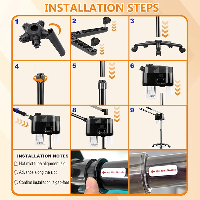 - Facial Steamer with Wheels: With five leg base and 5 quiet wheels, moves smoothly and quietly, and it can be easily Installation and disassembly, easy for cleaning