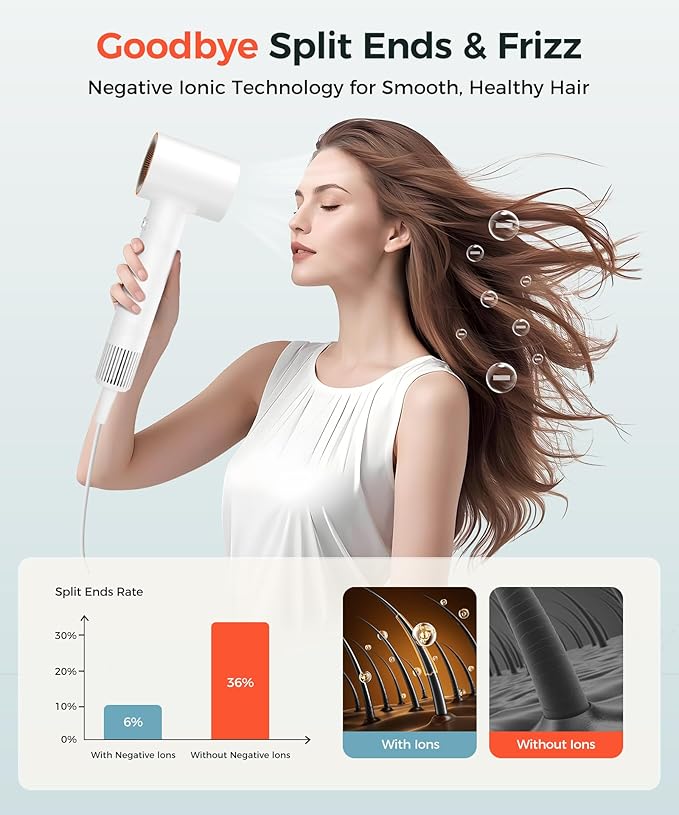 - All-New Ionic Hair Care System: The Cosy Companion blow dryer with diffuser utilizes advanced negative ionic technology to dynamically adjust negative ion concentration (200M-500M/cm³) based on real-time hair and environmental conditions. It releases 500M/cm³ ions to eliminate static frizz in dry conditions and reduces to 300M/cm³ in humid conditions, preventing stickiness and maintaining fluffiness. It also enhances repair of damaged hair, proven to reduce frizz by 50% and improve smoothness by 2 times, adapting intelligently to protect hair precisely