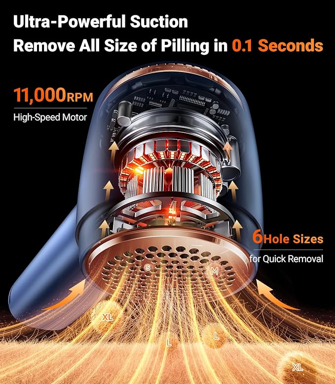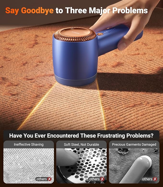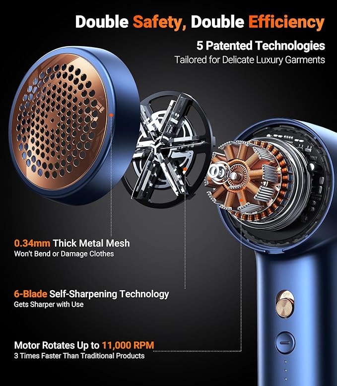 - [Triple Safety Protections] Protect your luxury clothing with triple safety protection mode. Once you open the net cover and lint container, the lint shaver rechargeable will automatically cut off the power to ensure the fabric's good condition and your safety. The electric lint remover for clothes maintains a safe distance between fabric and blades with the suck-shave technology, preventing clothing damage. Revitalize the fabrics in your cozy home with a brand new freshness.