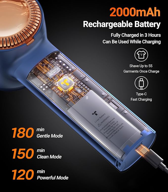 - [Wireless Use & Use while Charging] 2H charging can support 5H of use. One full charge of this electric clothes shaver can clean 50 pieces of clothes. You can also use this pilling remover for clothes while charging. Whenever you need it, it can always be ready for use.
