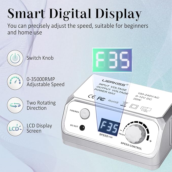 - Powerful Nail Drill: LIERKISS electric drill nails has a high-torque motor that delivers stable current power and speed, so you don't have to worry about the electric nail drill being weak or running out of power at any time, even the hardest nails can be easily handled.