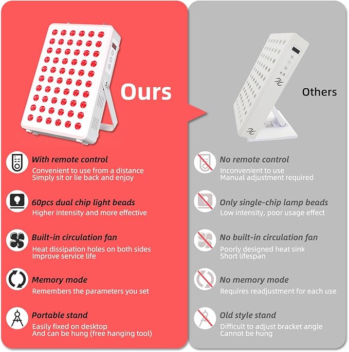 - This Red Light Panel is perfect for everyone who wants to experience red light. It is a best red light therapy device with 60 Dual Chip 5W LED lamp beads that emit red-light and NIR-light in a 1:1 ratio(Flicker-free). The 60-degree beam angle provides a larger area for coverage, the light distribution is also more even.