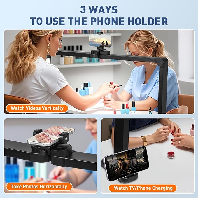 - 3 Ways Phone Holder Usage : Moon lamp nail techhorizontal/vertical placement on the top, record the manicure process/live broadcast, and there is a phone holder on the base, which is convenient for watching TV series and videos. The multifunctional nail art table lamp makes the manicure process no longer boring. Nail tech lamp is also suitable for manicure, eyelash extension, tattoo, reading and hand/facial care, makeup, online teaching and DIY projects.