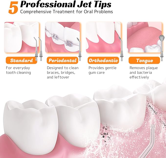 - 5 Professional 360° Rotating Tips: FlossJet Portable water flosser is equipped with 2 standard tips for daily oral hygiene; 1 orthodontic tip specifically designed for individuals with braces; 1 periodontal pocket tip for deep cleaning of the gums; and 1 tongue scraper tip that helps freshen breath. The combination of 360° rotating tips and high-pressure water pulses provides more effective cleaning for both teeth and dentures.