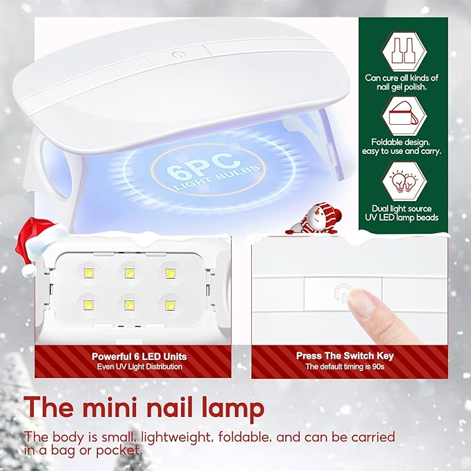 - Foldable Nail Light & Manicure Tools: This 6W mini nail light is small and lightweight, but powerful. It is designed to cure all kinds of U V nail gel. It's foldable and convenient to carry whenever and wherever you are. Nail tools include nail tips, nail files, nail brushes and nail art decorations that make you have more fun doing nail arts