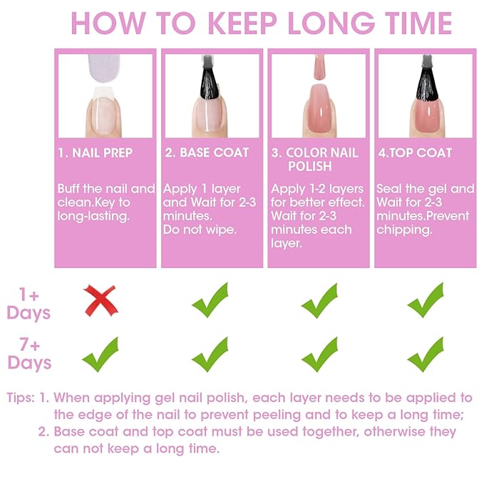 - Easy to Apply: 1, CIean and dry the nail surface. 2, Apply base coat and air dry for 1-2min. TIPS: If humid or cold, air dry for 3-5min, if hot, air dry for 1-2min. 3, Apply first layer color nail polish and air dry for 1-2min. Keep thin for first color layer. 4, Apply the second color layer, air dry for 1-2min. 5, Apply top coat and air dry for 1-2min. 6, HOW TO REMOVE: Cover the nail surface with a nail remover pad for 3-5s and then gently wipe off.