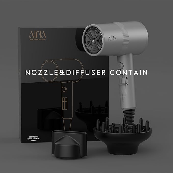 AINA Hair Dryer with Diffuser, Blow Dryer for Women | Advanced Ionic Technology, Ceramic Coating | Cold Shot Features Turbo Heat for Fast Drying and Shine 110V/ALCI (Ash Grey)