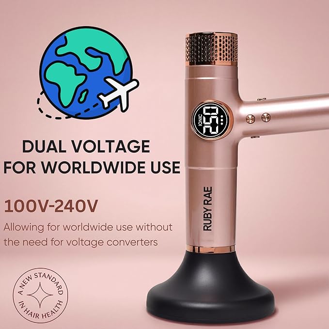 RUBY RAE Ionic Hair Dryer 2000W, Professional Dual Voltage Blow Dryer with Diffuser, Lightweight Design, Fast Drying, Low Noise Technology, 3 Magnetic Attachments Suitable for All Hair Types
