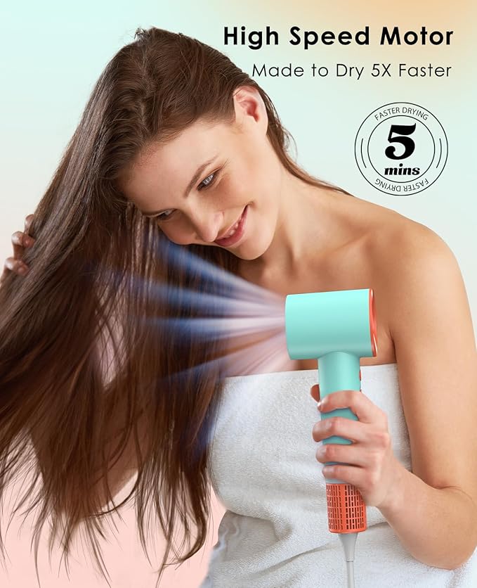 - High-Speed Motor: Our hair dryer is equipped with an ultra-powerful high-speed, 110,000 rpm brushless motor, generating an incredible airflow of 23m/s, Utilizing advanced infrared heating elements, it evaporates water molecules from your hair 50% faster than traditional dryers. Prepare to witness the magic of drying your hair in just a matter of minutes!