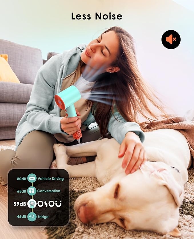 - Sleek and Lightweight Design: Our hair dryer weighs only 0.82 lb, making it easy to handle and carry. while the 5.9FT(1.8M) power cord provides ample length for convenient use both at home and in professional salon settings. Plus, the reduced noise level of only 59db ensures a more pleasant drying experience. TIPS: Nozzle is NOT magnetic.