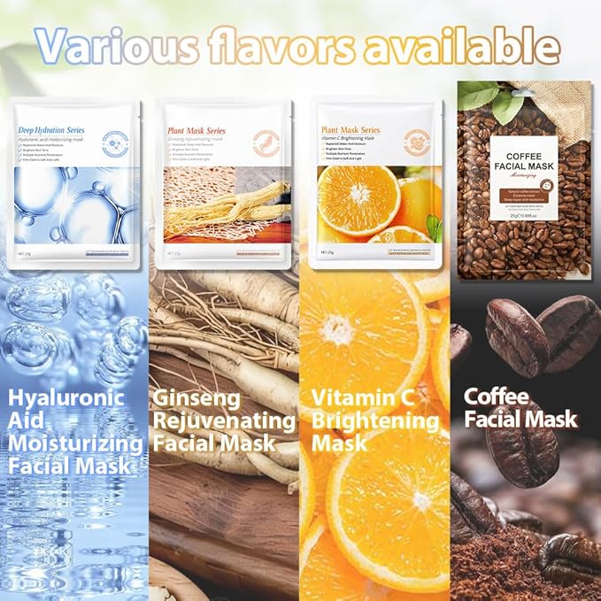 - 【12 Plant/Fruit Set】 Crafted from the finest natural ingredients, Aloe Vera, Pomegranate, Honey, Orange, Tea, Hyaluronic, Ginseng, Tea Tree, Cucumber, Rose, Avocado, Coffee, each component is carefully selected for its efficacy and compatibility with all skin types