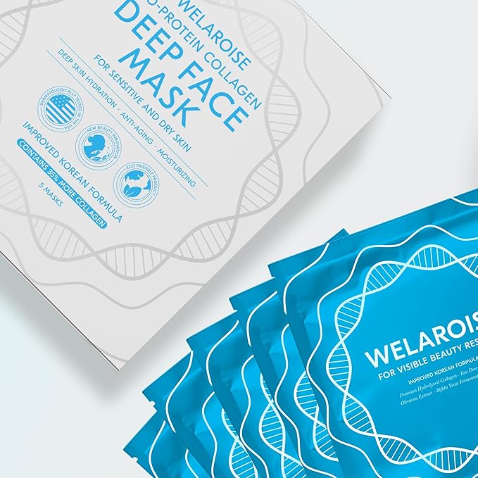 Welaroise Bio Protein Collagen Hydrogel Deep Face Mask +35% More Collagen, Intense Hydration & Moisturization, Firming, Anti-Aging, Skin Renewal, Korean Skincare (Pack of 5)