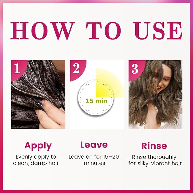 - Easy to Use: Apply amount of coloring conditioner to dry hair with gloves, then sit for 15-20 minutes, rinse it off and hair drying. Want the color to stand out better, try 2-3 times.(Tips: Warmth can open the hair cuticles for the best in total absorption, so after applying it, cover hair with a shower cap and use a blow dryer on medium heat to soak up more pigment.)