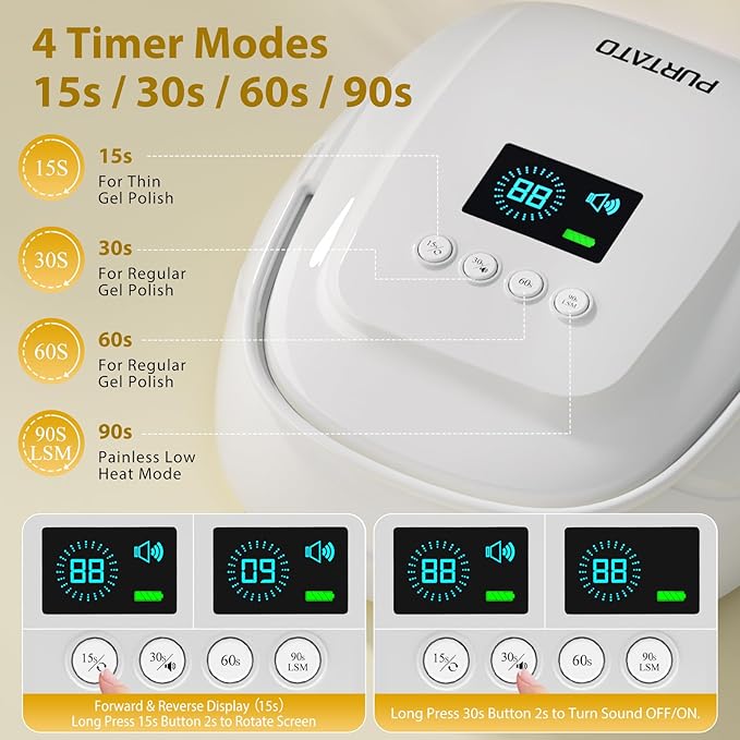 - 【4 Timer Settings & Smart Infrared Sensor】The PURTATO nail lamp offers flexible drying options with 10s, 30s, 60s, and 90s timer settings, all clearly shown on a large LCD screen. The built-in infrared sensor automatically turns the lamp on when you insert your hands or feet, and off when you remove them. A heat dissipation vent prevents overheating, extend Bulb Life