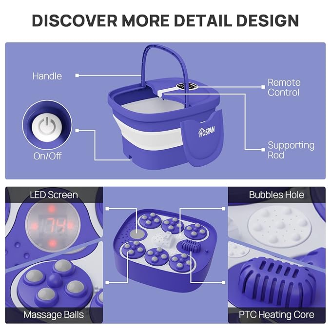 HOSPAN Collapsible Foot Spa Electric Rotary Massage, Foot Bath with Heat, Bubble, Remote, and 24 Motorized Shiatsu Massage Balls. Pedicure Foot Spa for Feet Stress Relief - FS02A