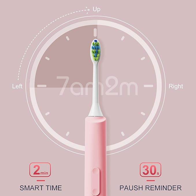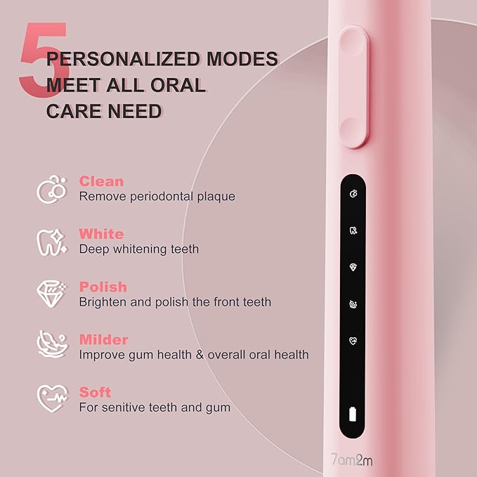 7AM2M Sonic Electric Toothbrush, High Power Rechargeable Toothbrushes, 5 Modes with 2 Minutes Built in Smart Timer, with 4 Brush Heads for Adults and Kids, One Charge for 60 Days (Pink)