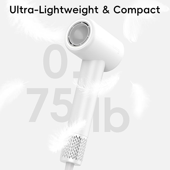 - [Lightweight+Compact, Ergonomic & Low-Noise Design] This portable hair dryer weighs just 0.75 lb—lighter than a standard coffee mug— and features a 360° magnetic rotating cord, making it easy to handle without arm fatigue, even during longer styling sessions. Engineered with a quiet motor and precision airflow system, it operates at only 51 dB to ensure a peaceful, comfortable drying experience, whether at home or on the go