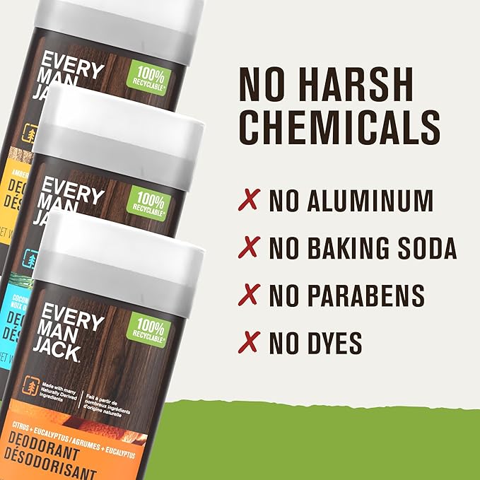 Every Man Jack Men's Deodorant Variety Set - Includes 3 Full-Sized Aluminum Free Natural Deodorant Sticks - Coconut + Driftwood, Citrus + Eucalyptus, Amber+ Sandalwood - 3oz (3 Pack)