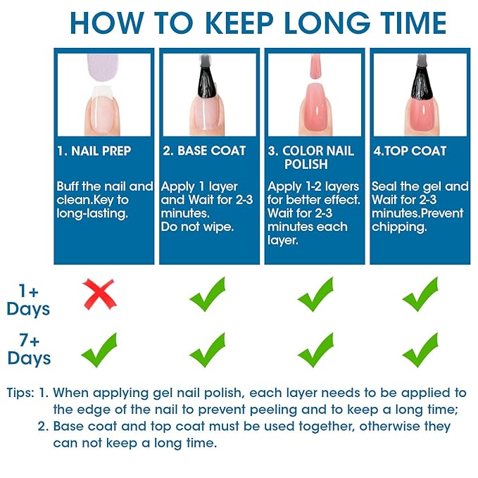 - Easy to Apply: 1, CIean and dry the nail surface. 2, Apply base coat and air dry for 1-2min. TIPS: If humid or cold, air dry for 3-5min, if hot, air dry for 1-2min. 3, Apply first layer color nail polish and air dry for 1-2min. Keep thin for first color layer. 4, Apply the second color layer, air dry for 1-2min. 5, Apply top coat and air dry for 1-2min. 6, HOW TO REMOVE: Cover the nail surface with a nail remover pad for 3-5s and then gently wipe off.