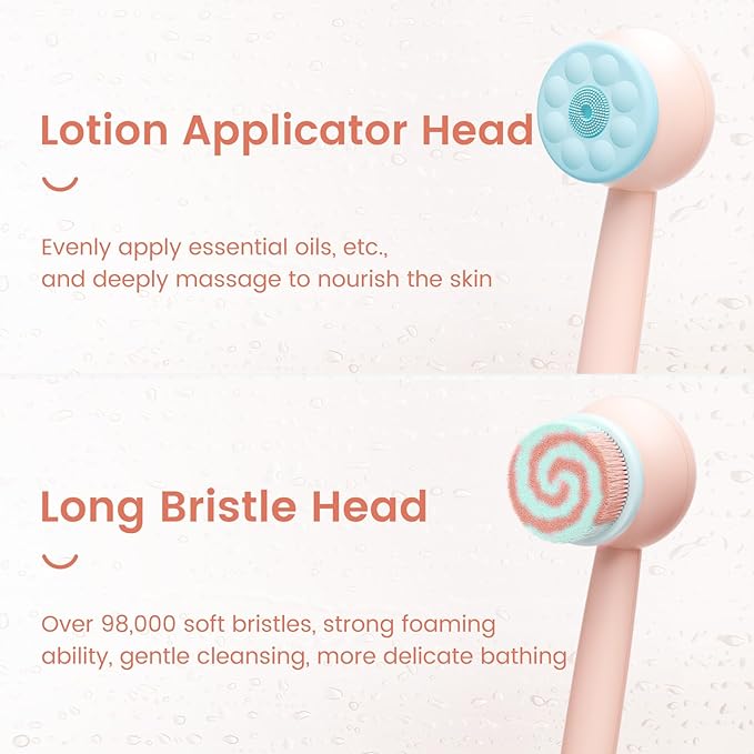 - Dual Brush Heads & Targeted Skin Care: Equipped with two interchangeable heads, this body scrubber meets different body care needs. The cleansing brush features 98,000 ultra-soft bristles that create a rich, delicate lather to deeply remove impurities without irritating the skin. The lotion applicator helps apply body lotion, essential oils, or moisturizers evenly - perfect for gentle hydration and after-shower care