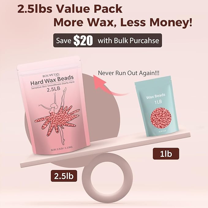 - Cost-Effective Bulk Pacakge: This 2.5lbs hard wax beads is ideal for full-body or frequent waxing. With ample quantity, it ensures hair-free skin for larger areas or ongoing maintenance, offering a more economical and convenient solution for at-home or professional use than small package. Never run out and enjoy flawless results every time!