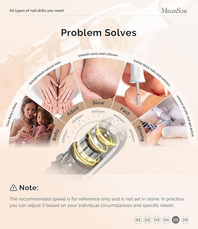 - 8-in-1 Professional Manicure and Pedicure Kit: Experience salon-quality nail care at home with the MelodySusie electric nail drill, featuring 8 versatile drill bits designed to meet all your hand and foot care needs. Effortlessly trim, grind, and polish natural nails, smooth corns and calluses, tackle thick nails and cuticles, or remove acrylic and gel polish. This is a perfect electric nail file kit for women, men, kids, seniors, and even pets, and it is user-friendly for beginners and experts alike.
