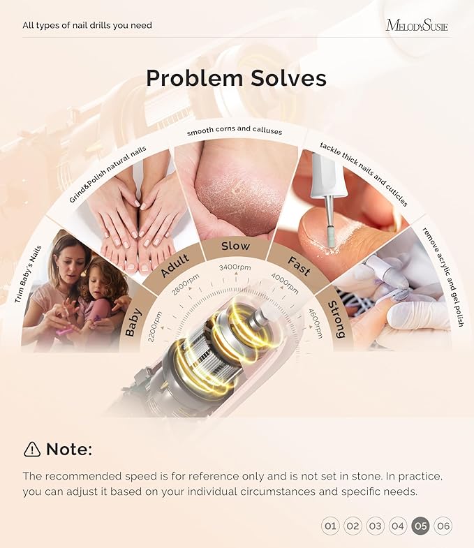 - 8-in-1 Professional Manicure and Pedicure Kit: Experience salon-quality nail care at home with the MelodySusie electric nail drill, featuring 8 versatile drill bits designed to meet all your hand and foot care needs. Effortlessly trim, grind, and polish natural nails, smooth corns and calluses, tackle thick nails and cuticles, or remove acrylic and gel polish. This is a perfect electric nail file kit for women, men, kids, seniors, and even pets, this electric nail file kit is user-friendly for beginners and experts alike.