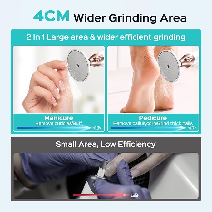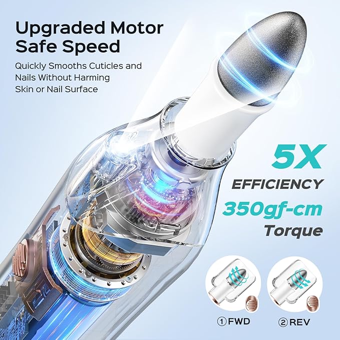 - 【Powerful Motor, Easy Cuticle Trimming】This nail grinder set with a quieter and more powerful motor, low vibration and quick heat dissipation. The upgraded motor torque can reach 425gf.cm, making it easier to trim and polish thick nails, dead skin, calluses and corns on hand and feet. You don't have to worry about the electric nail drill stopping when pressure is applied during grinding.