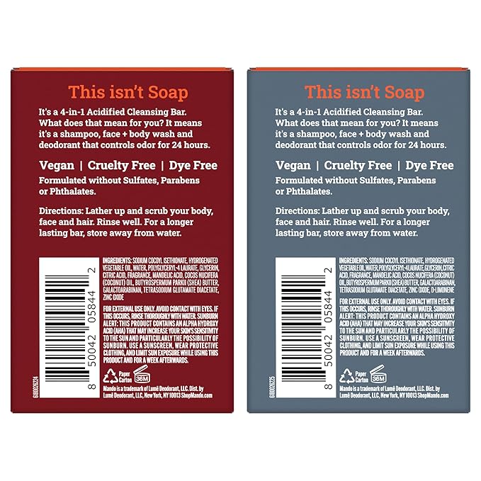 Mando 4-in-1 Acidified Cleansing Bar - 24-Hour Odor Control - Moisturizing Formula - Formulated without SLS and Parabens - Safe For Sensitive Skin - 5 ounces (Pack of 2) - Bourbon Leather & Mt Fuji