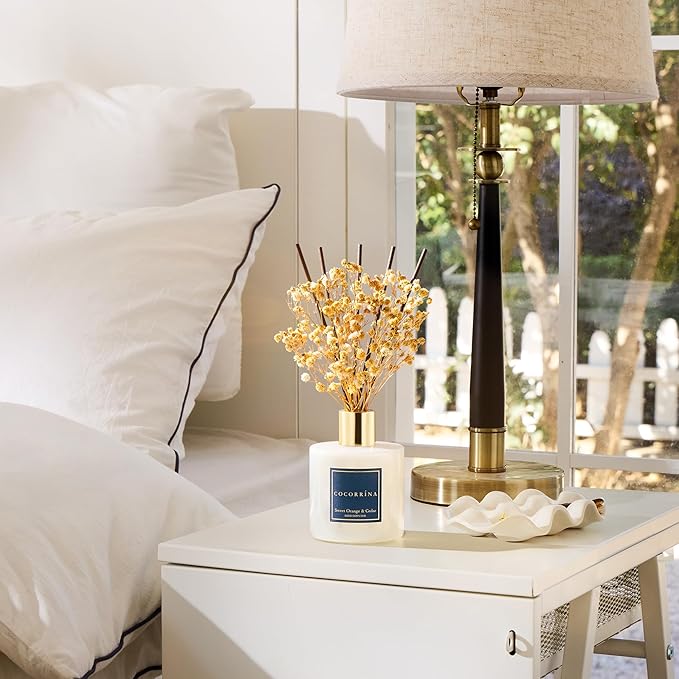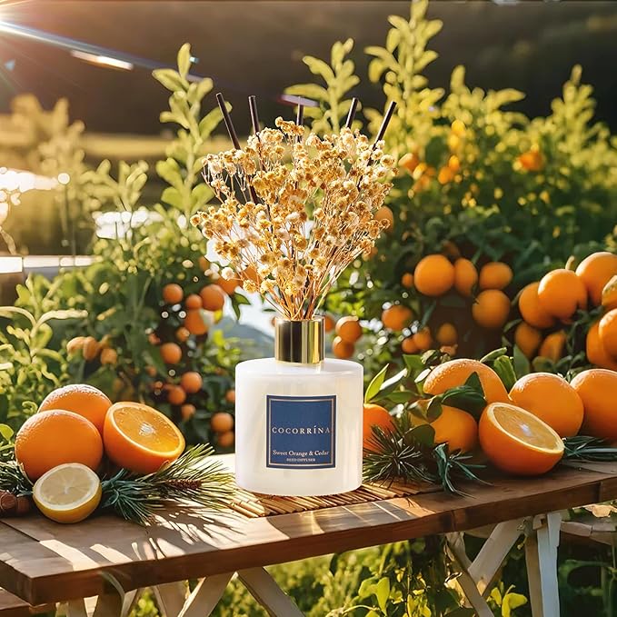COCORRÍNA Reed Diffuser - Sweet Orange & Cedar 6.7 Fl.oz Reed Diffuser Set with Sticks & Preserved Baby's Breath, Reed Diffuser for Home Bathroom Shelf Decor