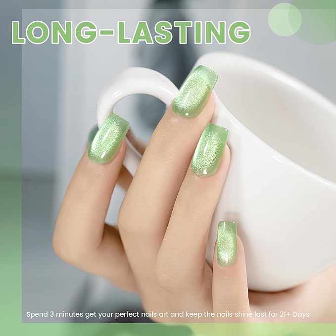 - EASY TO USE:This cateyes gel polish is made with with natural resin ingredients,magnetic shimmers and a smooth formula,so this gel polish set won't cause smudges cracks,or chips.It can last for 21+ days with perfect shine under proper application