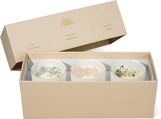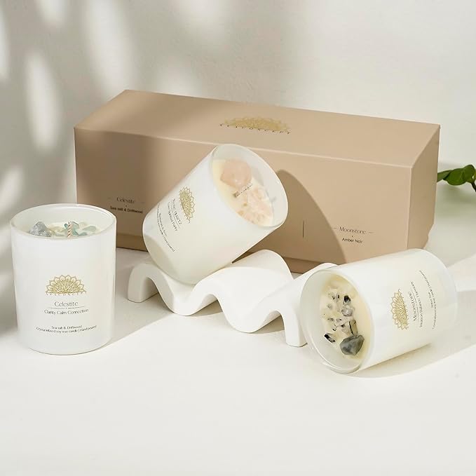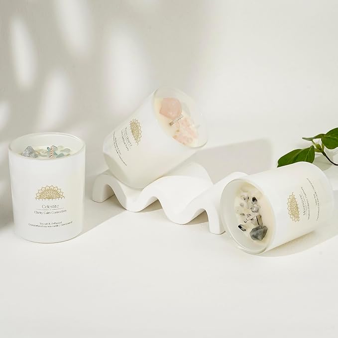 - Genuine Crystal Beauty: Each scented candle features real Rose Quartz, Moonstone, and Blue Celestite crystals that add natural beauty and elegant ambiance to your space. These spiritual candles combine aromatherapy with stunning aesthetics.