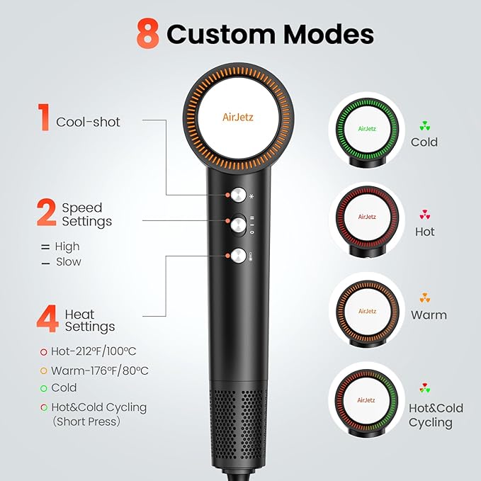 - 8 Drying Modes & Cool-shot Button: The hairdryer offers 4 heat settings (cold/warm(176℉/80℃)/hot(212℉/100℃)/hot & cold cycle mode), 2 speed settings (gentle/fast), and a cool-shot button. It also features an LED display with three different colors: Red for hot air, orange for warm air, green for cold air, and a green & red alternating gradient for the hot & cold cycle, allowing you to find the perfect setting for your hair type and desired style, ideal for all hair types.