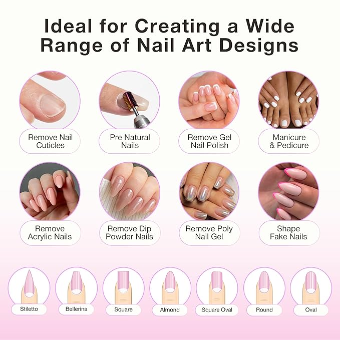 - LCD DISPLAY & CONVENIENT CONTROLS: Easily monitor your speed with the built-in LCD display that shows real-time adjustments. Our nail drill also offers forward/reverse settings and a pause function, giving you full control and flexibility to perform various nail care tasks, from prepping to shaping and finishing.