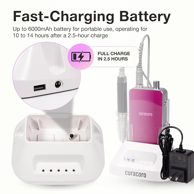 - FAST-CHARGING & LONG BATTERY LIFE: Curacoro Nail Drill features a fast-charging, rechargeable battery operating for 10 to 14 hours of continuous use after a 2.5-hour charge, providing you with long-lasting power for multiple sessions.