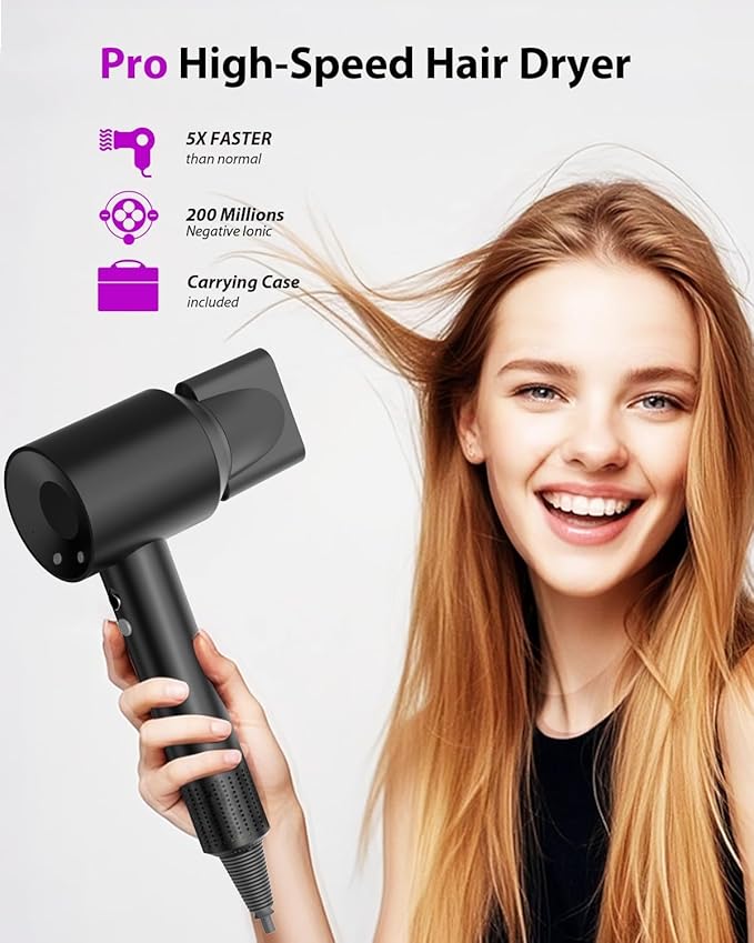 - ✅[Lightning-Fast Drying] Our high-speed hair dryer boast a maximum wind speed of 36m/s, it effortlessly removes moisture from your hair, drying it 5x faster and 80% more efficiently than traditional dryers.-Short hair? Done in just 1 minute. - Medium to long hair? Ready in 2 minutes. - Long hair? Perfectly dry in 4 minutes. Whether you're rushing out the door in the morning or unwinding after a long day, this ionic hair dryer transforms your hair care routine into a quick, enjoyable experience