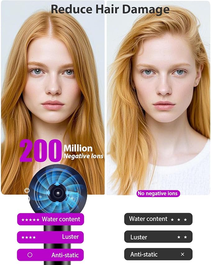 - ✅[Advanced Ionic Care for Silky-Smooth Hair] With the power of 200 million negative ions to deeply nourish your hair, repairing and protecting the cuticle layer for a healthier, shinier look. Say goodbye to frizz and tangles. Our hairdryer ha innovative technology attracts moisture molecules from the air, forming a protective layer on your hair to lock in hydration and enhance smoothness. With every use, your hair becomes silkier, softer and easier to manage—effortless great hair days every day