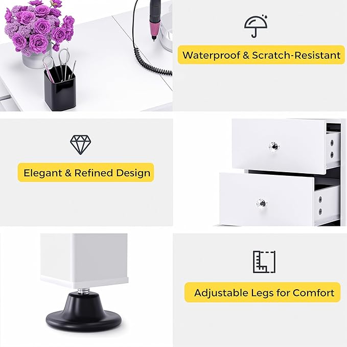 - 【Stylish & Durable for Any Setting】Designed with a waterproof and acetone-resistant surface, this nail table is ideal for nail salons, spas, home beauty setups, or mobile nail services at trade shows and pop-up events. Its modern look and reliable build make it a must-have for professionals and enthusiasts.