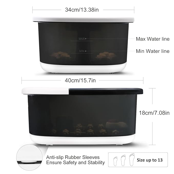 - 【Fast Heating & Intelligent Temperature Control】FutureCare Foot Spa Bath Massager with Heat Bubbles and Vibration Massage and Jets can heat up water efficiently and maintain water at selected temperature (95-118°F). Its 500W PTC Heater is with safe and secure multi-insulation protection and overheating protection, so you needn't worry about the safety. For Home Footbath, soaking feet in FutureCare foot bucket can not only enhance the therapeutic effect, but also help relieve fatigue, swelling & redness.