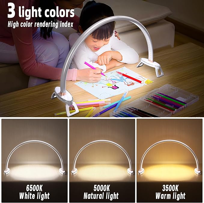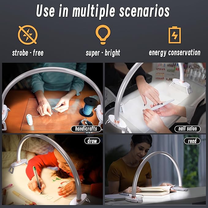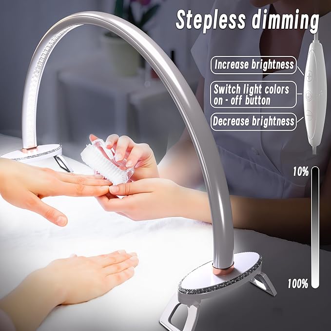 - 【3 Color & Brightness Modes】Half moon light for nail desk with stepless dimming(10% - 100%) and 3 color temperature(3500-5000-6500K), The desk lamp for office home makes to create multiple lighting combinations, You can customize the lighting to your liking! nail tech desk lamp has a memory function and will maintain the previous mode when it is lit again.
