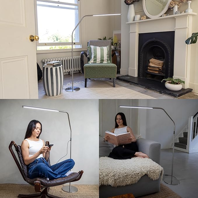 daylight Slimline 4™ LED Floor Lamp in Brushed Steel - 6,000K, 3,200 Lux, 4 Brightness Levels, USB-C Charging Port, Anti-Glare Diffuser, Flexible Design, Art & Craft, Sewing, Nail Salon