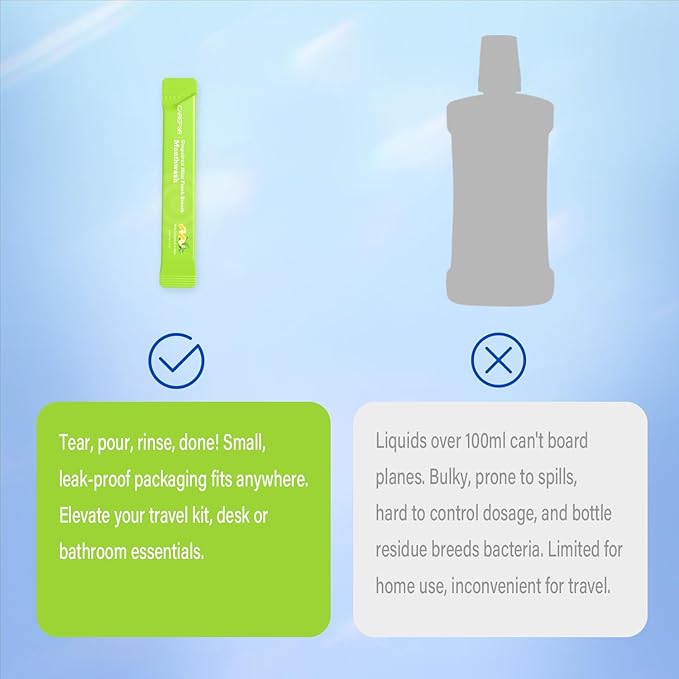 - Effortless On-the-Go Oral Care:Tear, pour, gargle, done! Compact, leak-proof packets fit anywhere. Elevate your travel kit, office desk, or bathroom essentials with this fuss-free, alcohol-free solution.