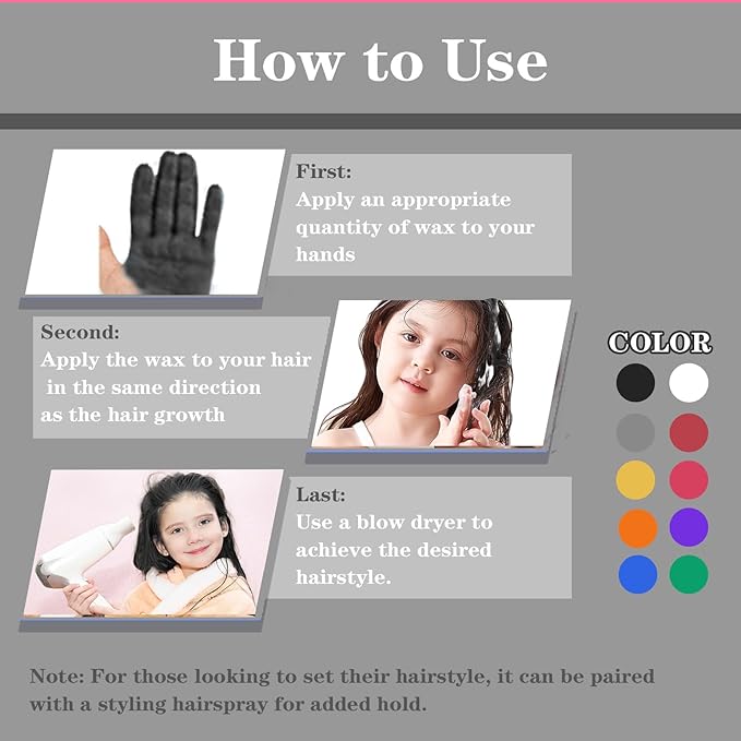 - Instant & Effortless Hair Transformation-Achieve a bold new look in just seconds with our easy-to-apply hair wax. Whether you’re experimenting with a new color or preparing for a special occasion, you can change your hair color without the need for a salon visit—no damage, no fuss!