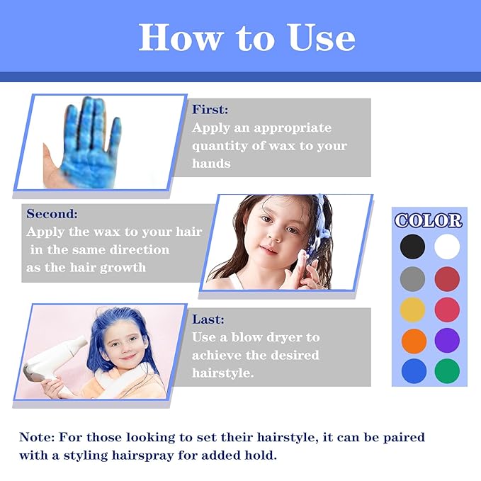 - Safe & Fun Temporary Hair Color Wax for Kids and Adults-This Temporary Hair Color Wax is designed with safety in mind, made without harmful chemicals to ensure strong hold and a shiny, vibrant color. It’s gentle on the scalp, causing no irritation, and is completely safe to use for both kids and adults.