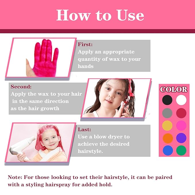- Instant & Effortless Hair Transformation-Achieve a bold new look in just seconds with our easy-to-apply hair wax. Whether you’re experimenting with a new color or preparing for a special occasion, you can change your hair color without the need for a salon visit—no damage, no fuss!