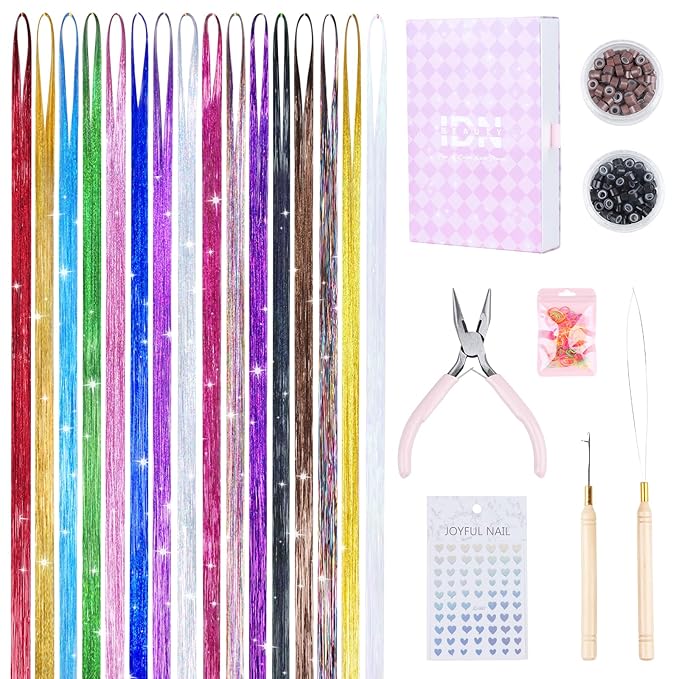 - 16 Color Hair Tinsel with Tool: Total of 16 packs of popular colors in 2025, with pliers*1, hair extension rings*2 packs, laser stickers*1, hair crochet hooks*2, convenient for creating a full head hairstyle.