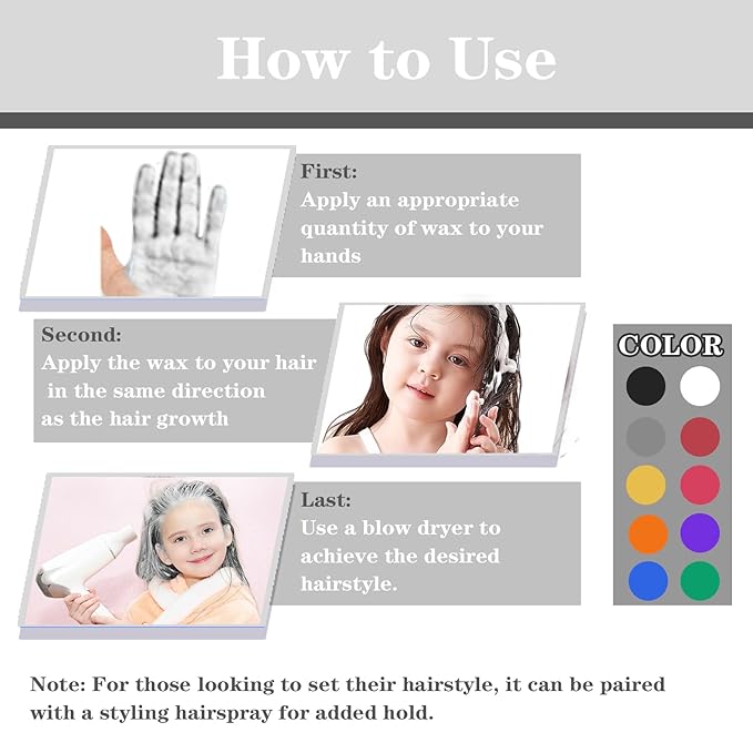 - Instant & Effortless Hair Transformation-Achieve a bold new look in just seconds with our easy-to-apply hair wax. Whether you’re experimenting with a new color or preparing for a special occasion, you can change your hair color without the need for a salon visit—no damage, no fuss!