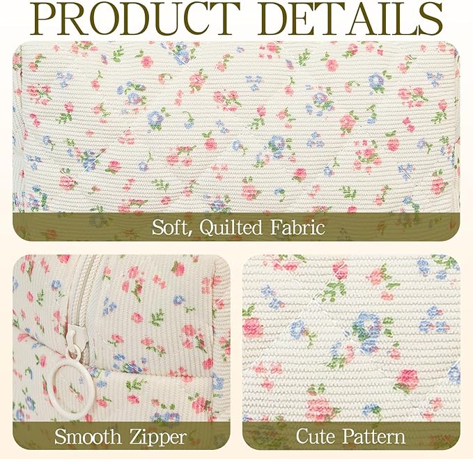 Quilted Makeup Pouch,Cotton Puffy Makeup Bag, Coquette Cosmetic Bag for Women and Girls, Aesthetic Organizer Bag, Cute Flower Travel Toiletry Bag
