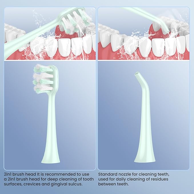 - 【Various accessories】Package: 1* Device Body, 3* 2 in1 Brush Head, 1* Standard Nozzle, 1* cleaning brush,1* Charging base, 1* Charging Cable, 1* User Manual.The 2-in-1 water flosser package includes a charging base and charging cable. Equipped with a cleaning brush, cleaning is more convenient