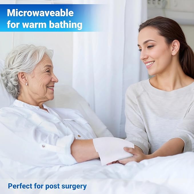 - MICROWAVABLE WIPE - microwaveable for a warm, luxurious clean. Each extra large shower wipe is soaked with extra moisture and can be microwaved for warm bathing. No sticky residues. Hypoallergenic. Suitable for post-surgery. One sheet of wipe is big enough (8"x12") to clean your full body